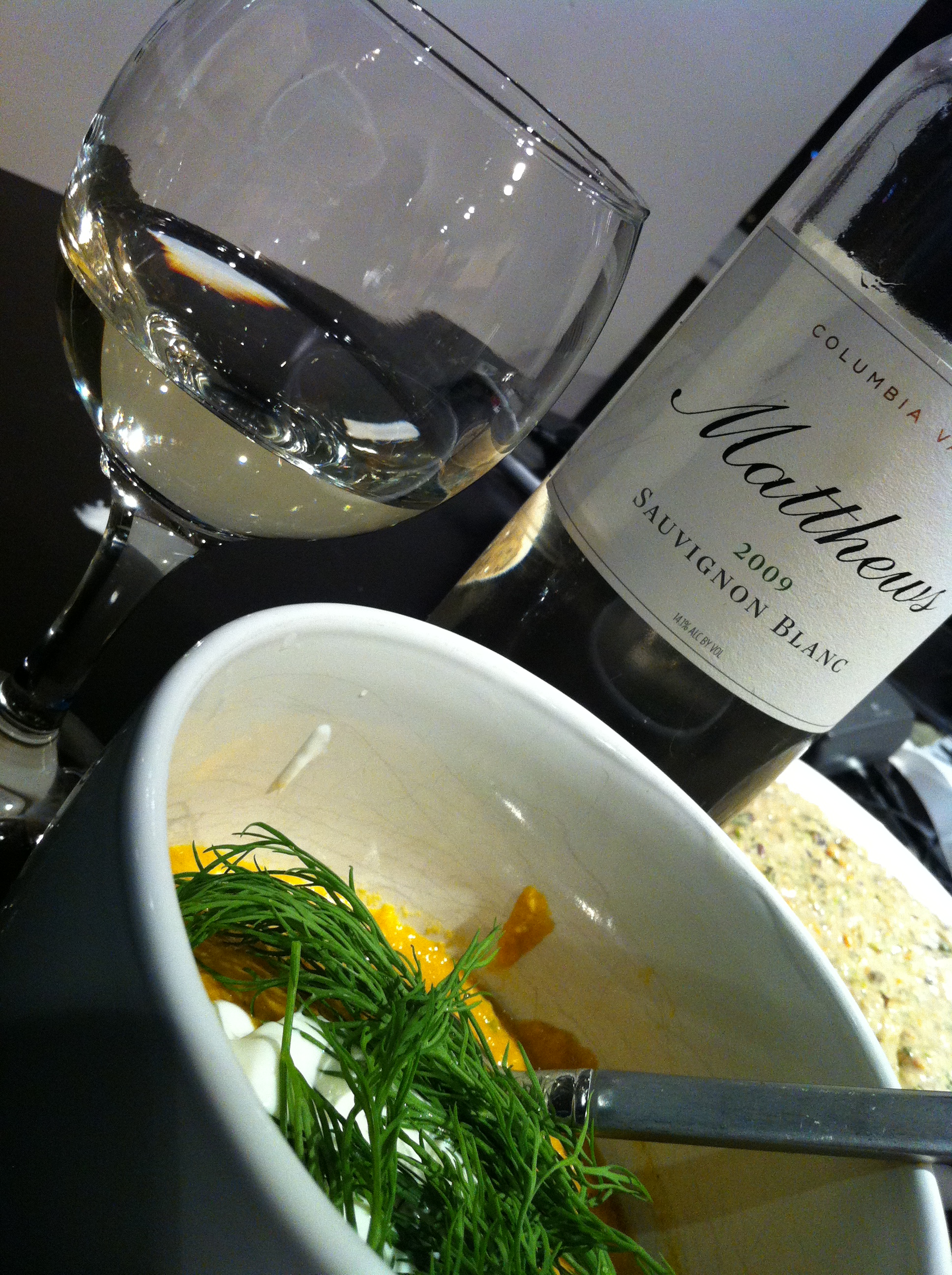 Matthews Estate Sauvignon Blanc 2009 paired with homemade carrot-ginger soup topped with sour cream and dill.
