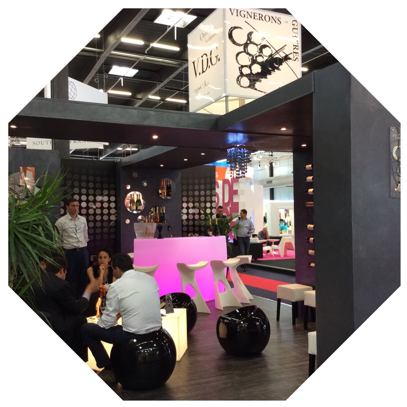 The V.D.G. Vignerons booth expressed a futuristic-classy feel. Clean lines, curvy shapes, and fun-globular chairs.